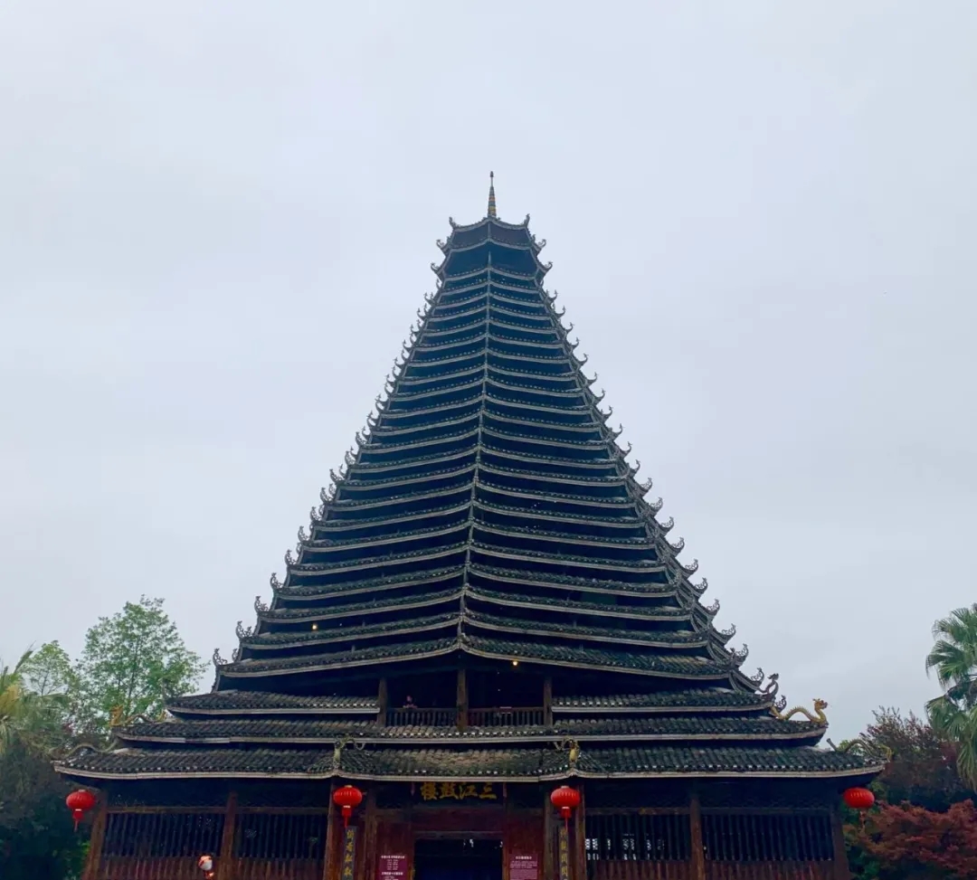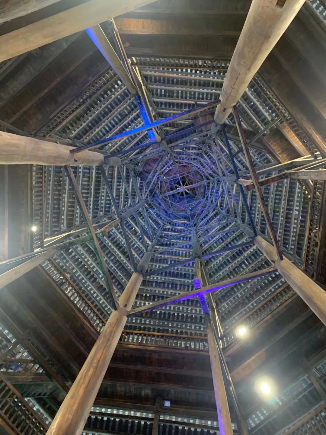 仰觀閃閃魔幻,感受侗族建設(shè)的精美藝術(shù),把疏密、粗細、剛?cè)岬韧昝赖亟Y(jié)成一個整體,展現(xiàn)侗族工匠的精美建筑技藝。不用一顆鐵釘,結(jié)構(gòu)十分嚴(yán)謹(jǐn)穩(wěn)固。樓內(nèi)四根杉木大柱直徑都超過70厘米,樹齡均在百年以上,這在鼓樓建筑史上是唯一的。