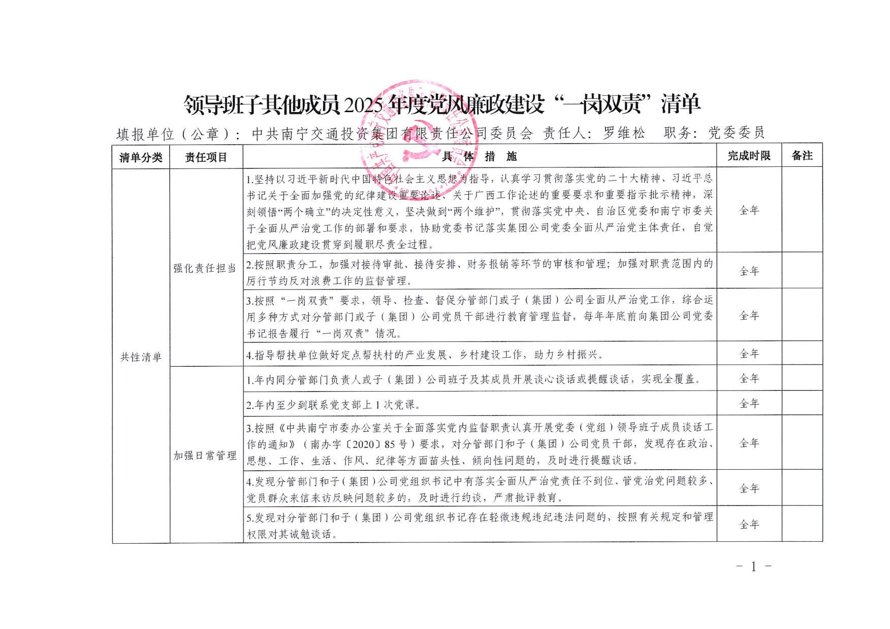 南寧交投集團領(lǐng)導(dǎo)班子其他成員2025年度黨風(fēng)廉政建設(shè)“一崗雙責(zé)”清單(五)