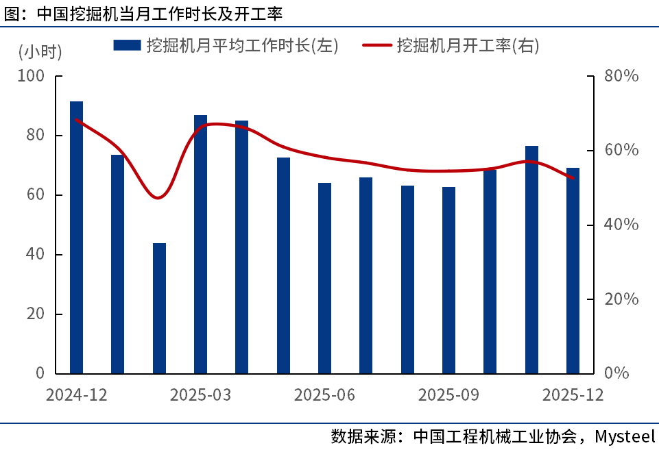 2025年12月工程機(jī)械主要產(chǎn)品月平均工作時(shí)長為76.5小時(shí),同比下降18.6%,環(huán)比下降9.19%。其中:挖掘機(jī)69.3小時(shí);裝載機(jī)80.4小時(shí);汽車起重機(jī)93.8小時(shí);履帶起重機(jī)94.7小時(shí);塔式起重機(jī)43.9小時(shí);壓路機(jī)24.9小時(shí);攤鋪機(jī)35.9小時(shí);旋挖鉆機(jī)72.4小時(shí);非公路礦用自卸車154小時(shí);混凝土泵車39.5小時(shí);混凝土攪拌車53.8小時(shí);叉車110小時(shí)。