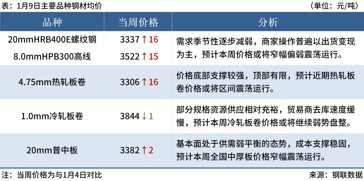 ◎ 1月11日,江蘇永鋼出臺1月中旬出廠價,螺紋鋼、線材、盤螺平穩(wěn),現(xiàn)螺紋鋼3450元/噸,線材盤螺3700元/噸。1月10日,中天鋼鐵出臺1月中旬價格,螺紋鋼、線材、盤螺平穩(wěn),現(xiàn)華東螺紋3400元/噸、線材盤螺3650元/噸。